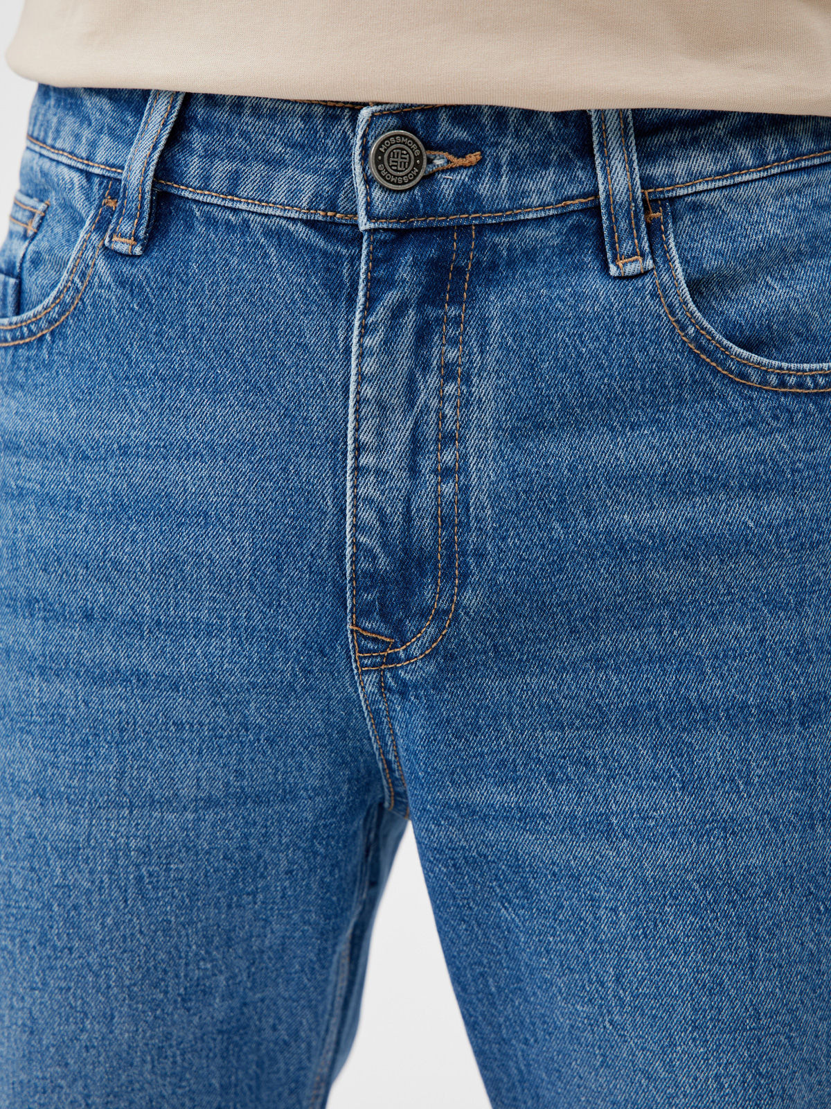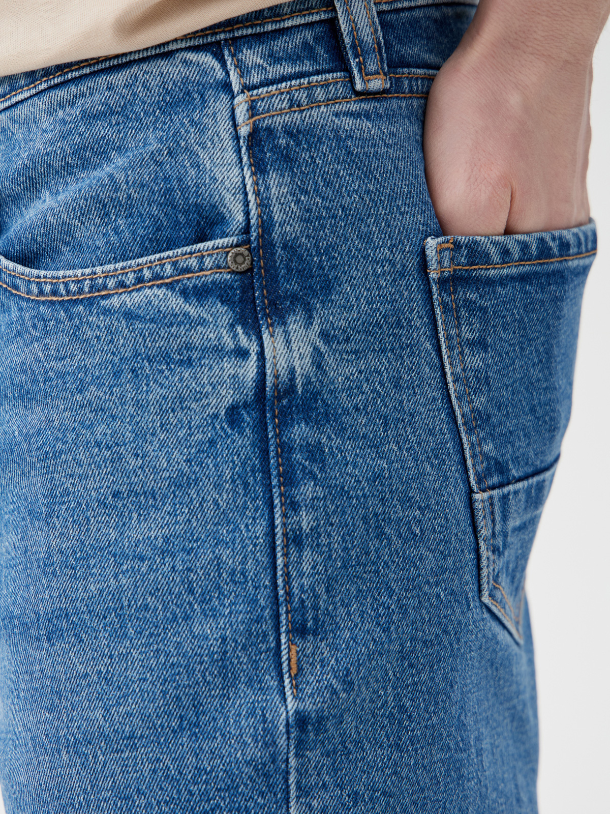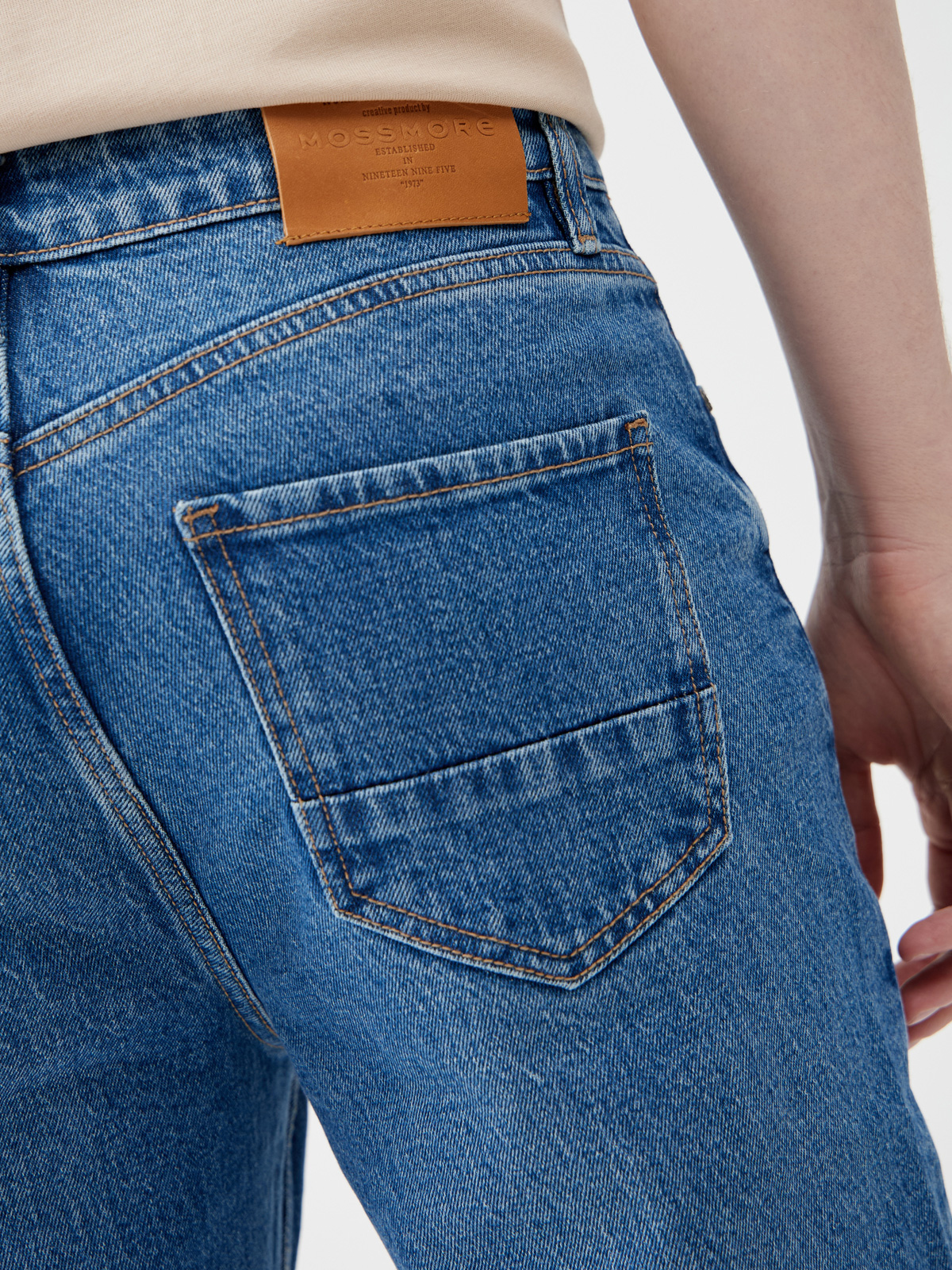 Джинсы силуэта мом из хлопкового денима с добавлением эластана на рост 174-180 см. Каждая пара джинсов изготовлена из мягкого хлопкового денима с добавлением эластана, что обеспечивает комфортную посадку и отличную растяжимость. Натуральный состав ткани позволяет коже «дышать», а также обеспечивает долговечность и износостойкость изделия. Джинсы представлены в двух уникальных оттенках синего: один с эффектом "варенки" и потертостями, а второй с винтажным эффектом. Тинтовый эффект или легкий износ, специальные потертости и стильные детали придают джинсам оригинальный вид, словно они пережили множество приключений. Каждая пара уникальна и добавляет индивидуальности вашему гардеробу. Оба варианта имеют собственный характер и отлично подойдут для создания стильных образов. Контрастная строчка подчеркивает детали и добавляет динамику дизайну, а ручная обработка потертостей краев карманов придает уникальность каждой паре. Данная модель включает в себя классическую пятикарманную конструкцию