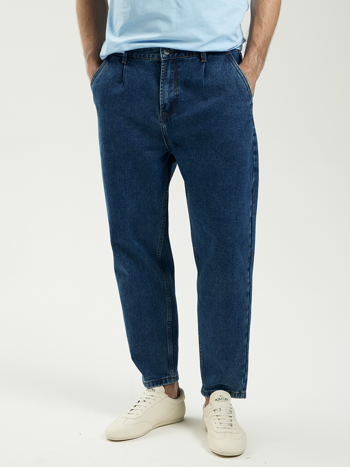 Темные джинсы из плотного однотонного денима (13,2 oz) объемного на бедрах силуэта мом из 100% хлопка. Четырехкарманная модель на рост 170-176 см с защипами спереди и ложным монетным карманом спереди. На талии есть шлёвки для ремня, а также фирменный патч из темной экокожи "Mossmore". Застёжка на молнию и болт-пуговицу. Размер на модели 32, рост 187 см.