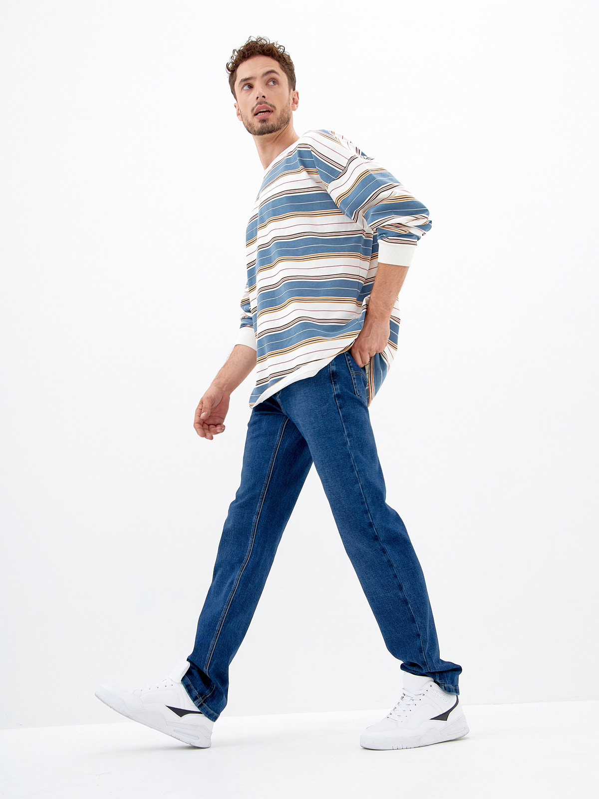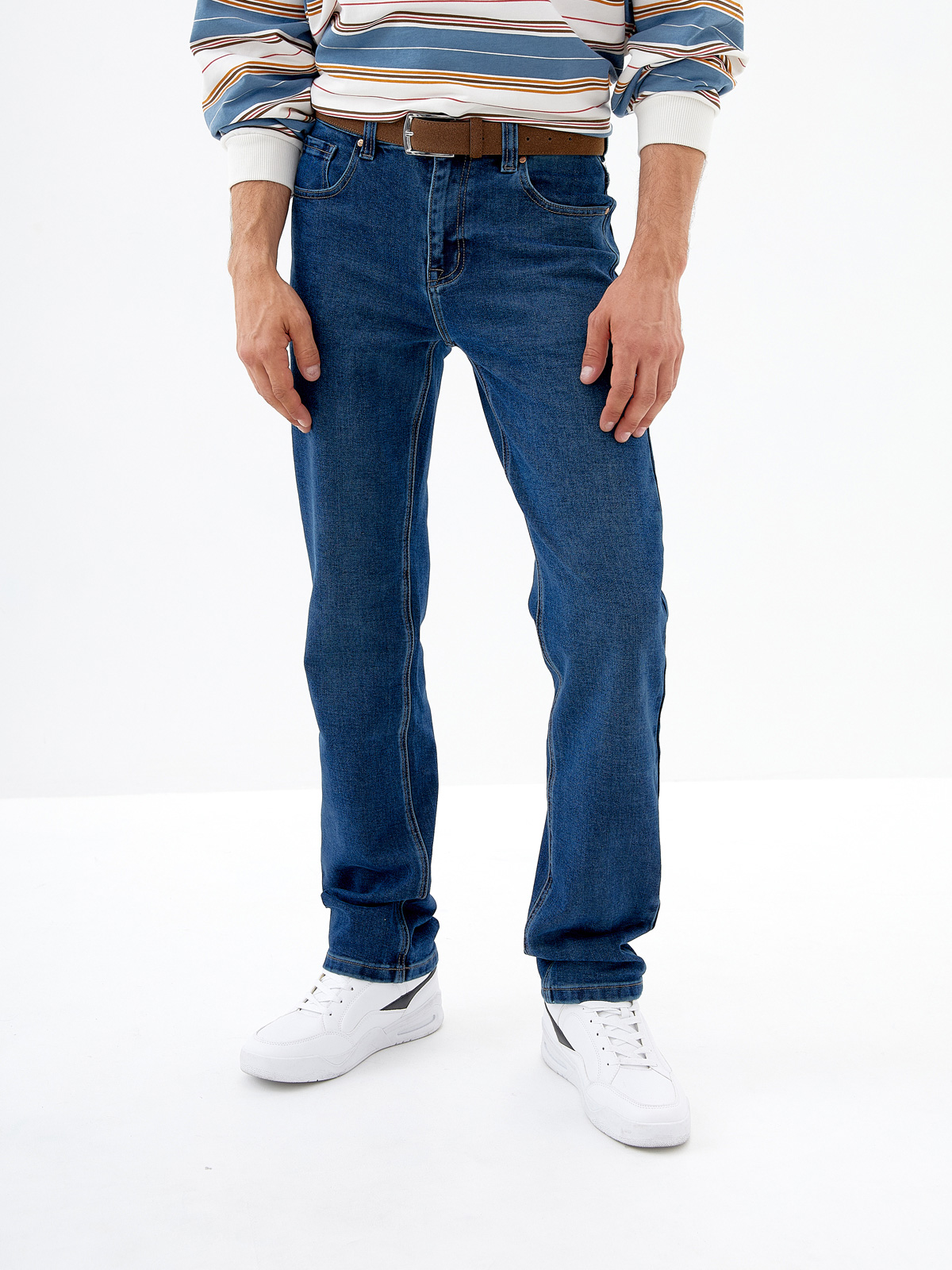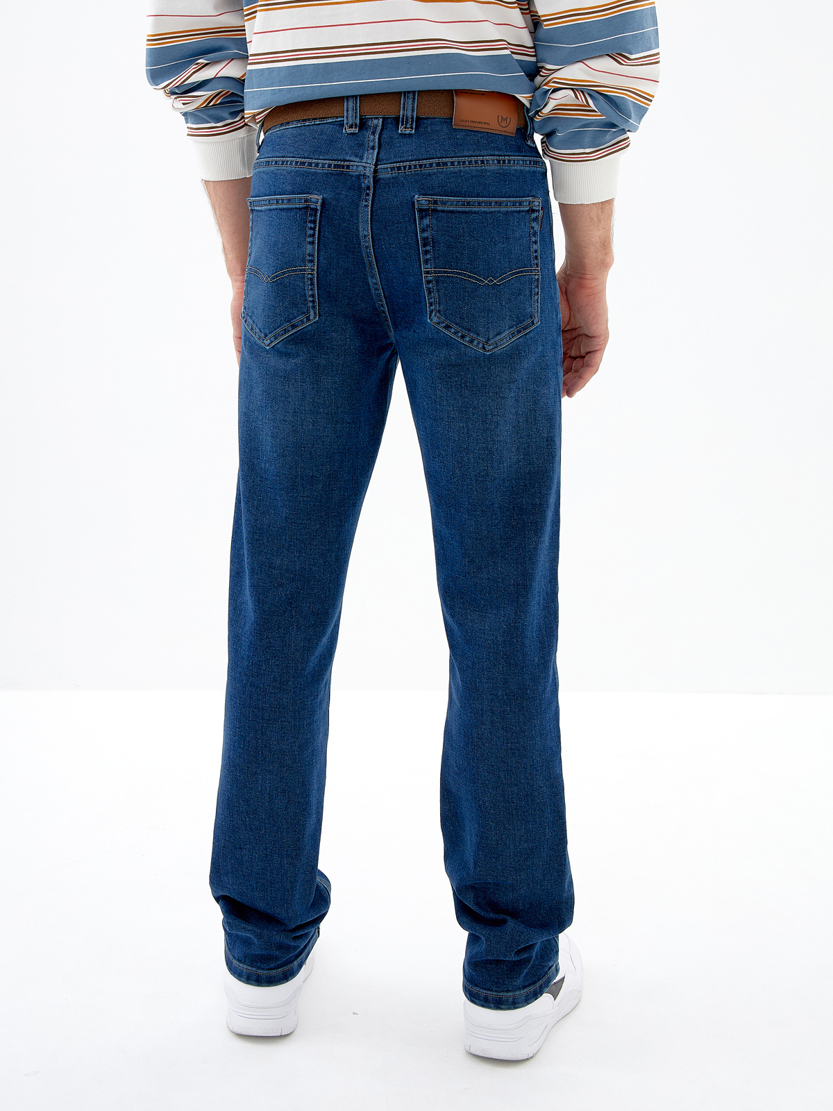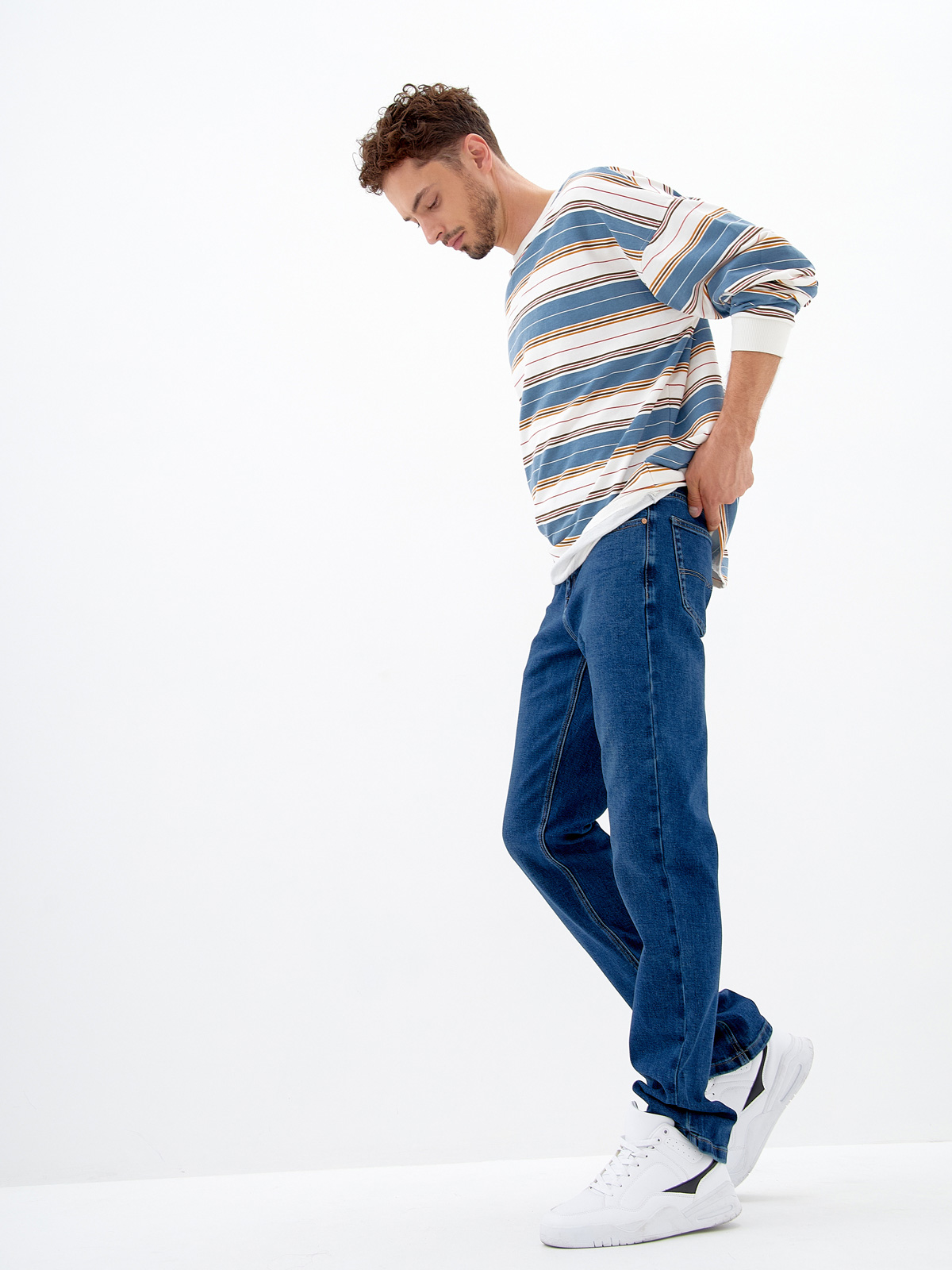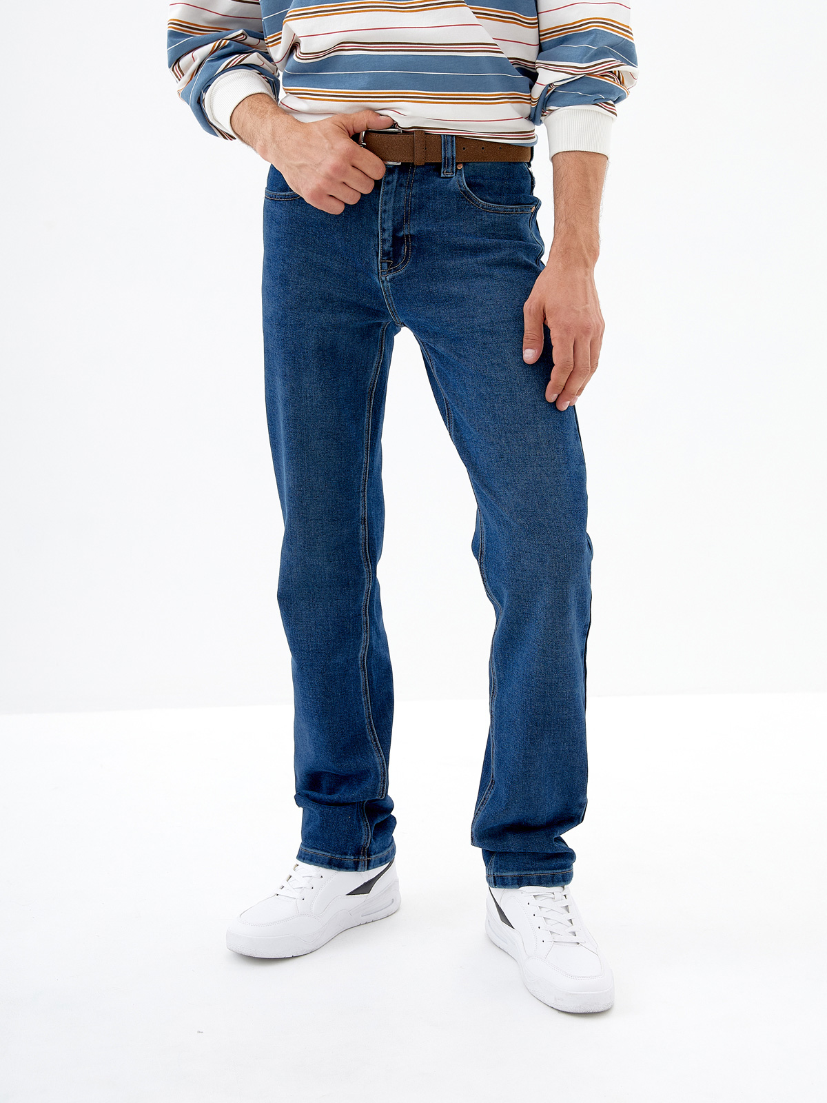 Джинсы широкого кроя из плотного хлопкового денима имеют несколько ростовок. Плотная ткань с добавлением эластана обеспечивает комфортную посадку и свободу движений. Широкие штанины с прямым силуэтом визуально вытягивают и стройнят фигуру. Контрастная строчка насыщенного красного цвета по внутреннему шву брючин добавляет динамики и подчеркивает качество изделия. Особенности: небольшие потертости денима, классический пятикарманный крой, шлевки для ремня и фирменные заклепки. Декоративные фигурные строчки на задних карманах придают джинсам современный вид. Фирменный узкий лейбл на внутренней стороне ширинки подчеркивает фирменный дизайн.Детали: широкий прямой крой, классическая посадка на талии, застёжка на металлическую молнию и пуговицу, пять карманов, шлёвки для ремня.
