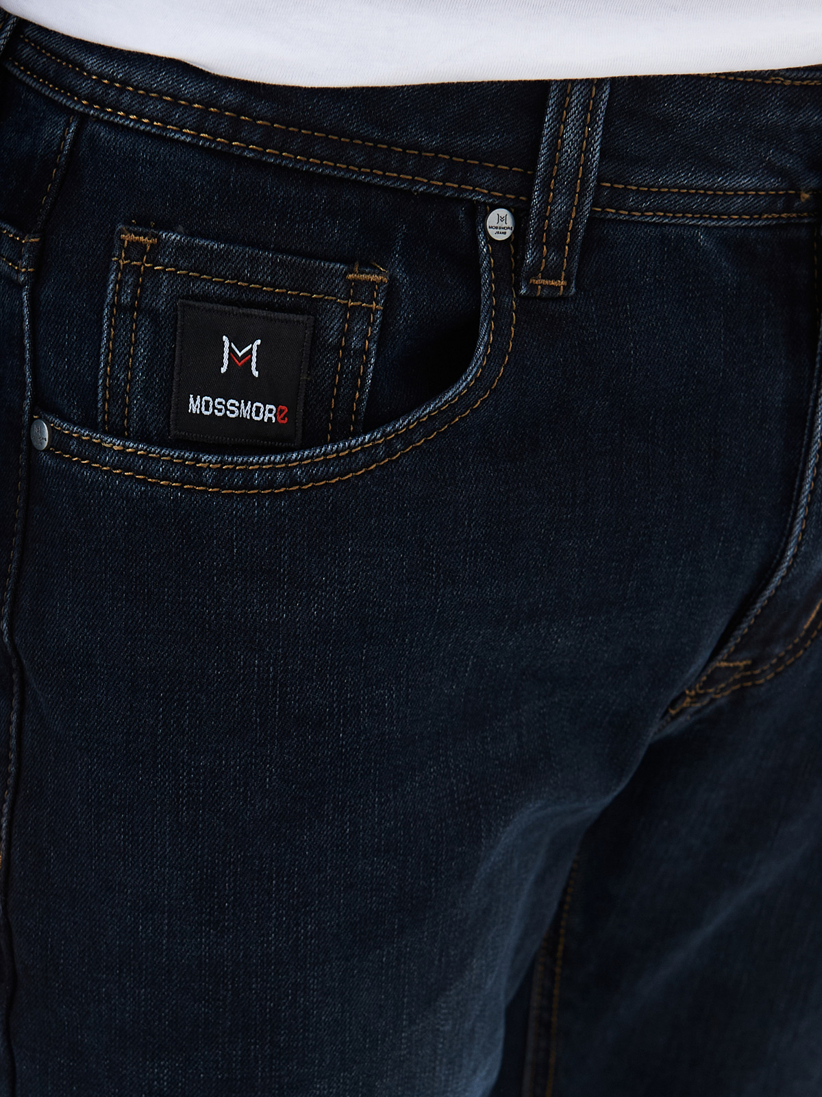 Синий цвет BLUE-BLACK с красными строчками внутреннего шва, небольшими потёртостями и металлическими заклёпками придаёт джинсам модный и мужской вид. На монетном кармане и кармане сзади расположен пришивной лейбл "Mossmore", подчёркивающий качество и принадлежность к бренду.