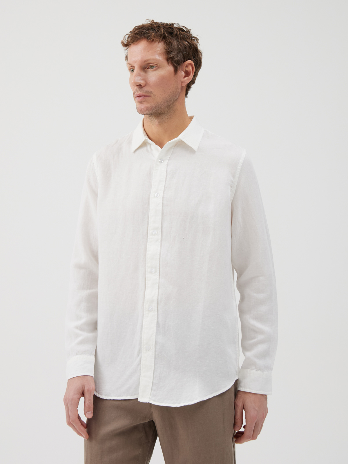 Рубашка мужская из льна и тенсела с длинными рукавами и застёжкой на пуговицы. Комбинация этих двух материалов обеспечивает рубашке легкость и дышащие свойства. Лен гарантирует хорошую воздухопроницаемость, а тенсел добавляет мягкость и блеск, что делает изделие приятным на ощупь и комфортным в носке. Длинные рукава с манжетами придают рубашке классический вид и позволяют регулировать длину рукава, создавая стильный образ как в распущенном, так и закатанном виде. Удобная петля на спинке позволяет повесить рубашку, сохранять её в идеальном состоянии и добавляет интересный акцент к общему дизайну. Классический отложной воротник придает рубашке универсальность, позволяя носить её как самостоятельно, так и в качестве второго слоя на футболку или под пиджак. Воротник также добавляет в образ элегантности и формальности. Рубашка представлена в нескольких оттенках: от белого и бежевого до темно-синего. Это разнообразие цветов делает её универсальным элементом, легко вписывающимся в различные образы.