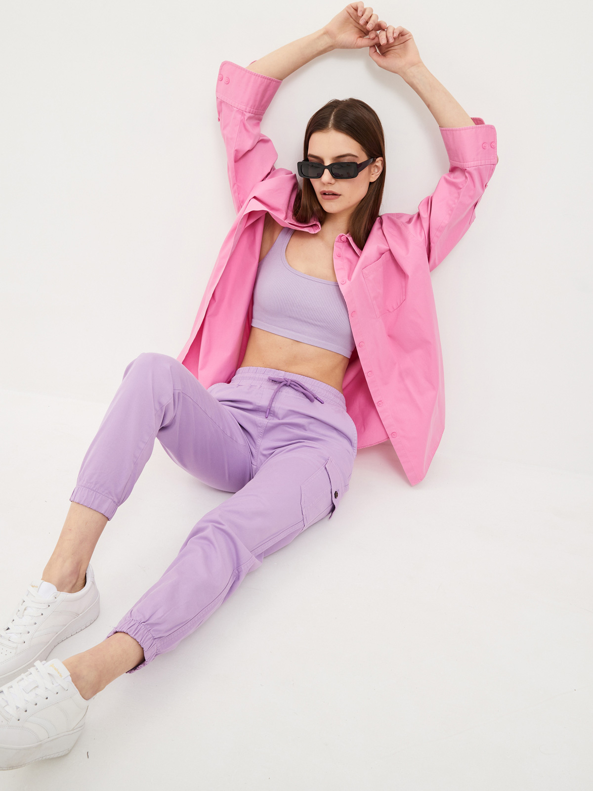 Брюки-джоггеры из эластичной хлопковой ткани средней плотности с прямыми брючинами собранными на резинку по нижнему краю, а также дополнительными накладными карманами с клапанами с застёжкой на пуговицу. Модель с эластичной талией на кулиске с завязкой на шнурок, боковыми карманами и имитацией карманов сзади. Размер на модели 26, рост 178 см.