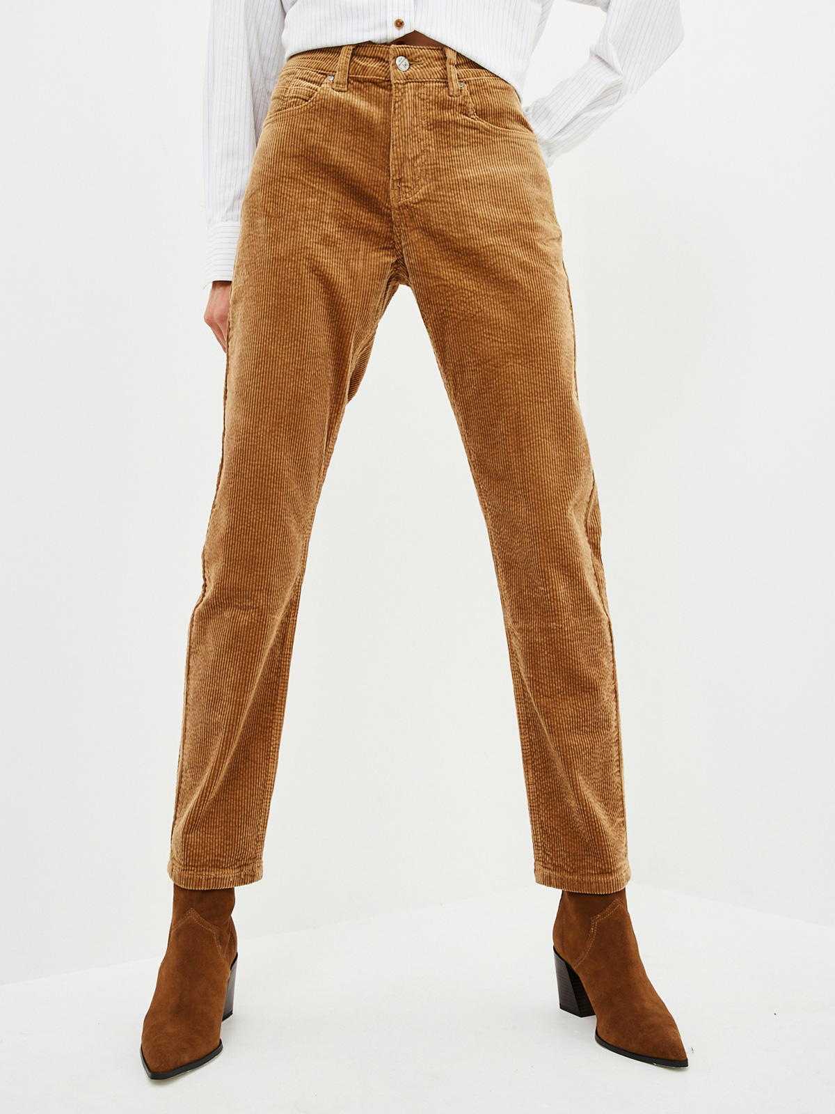 Хлопковые брюки силуэта бойфренд из плотной вельветовой ткани с матовым бархатным эффектом. Пятикарманная модель на рост 164-170 см с декорированным монетным карманом и металлическими заклепками на карманах спереди. На талии есть шлёвки для ремня и патч из экокожи "Mossmore". Размер на модели 27, рост 179 см.