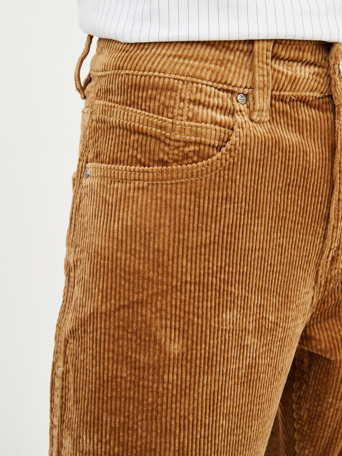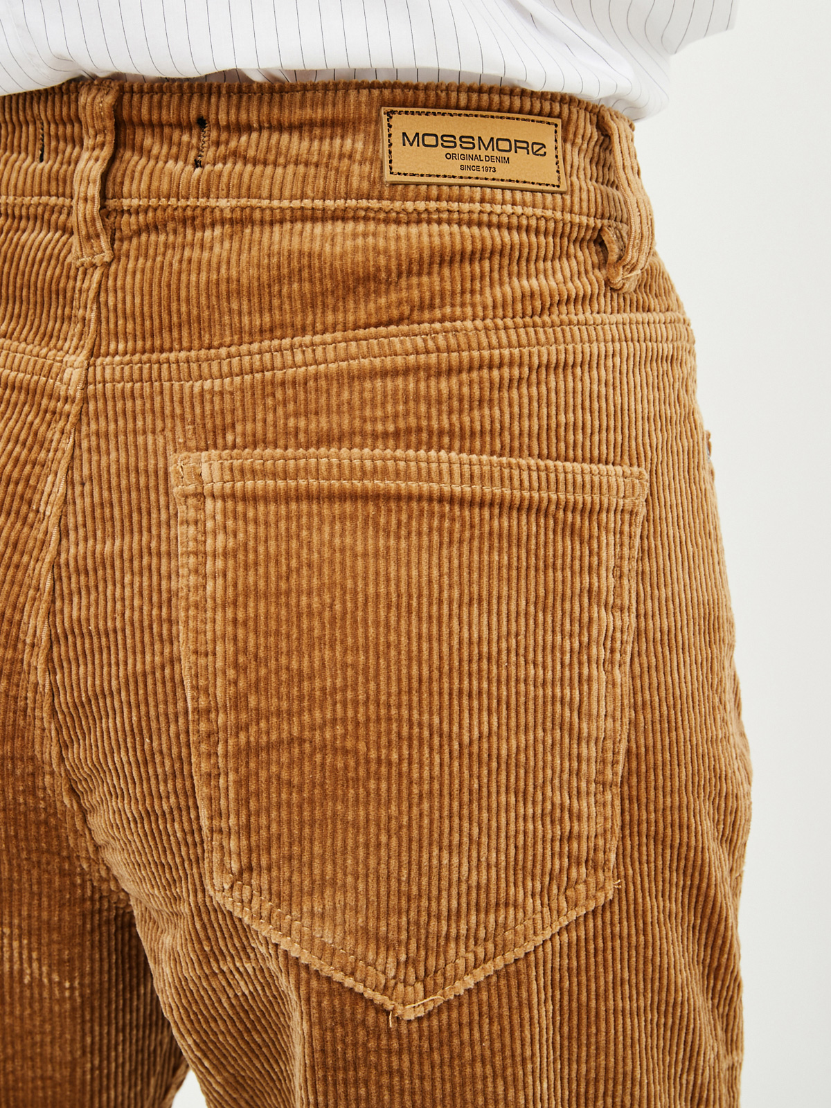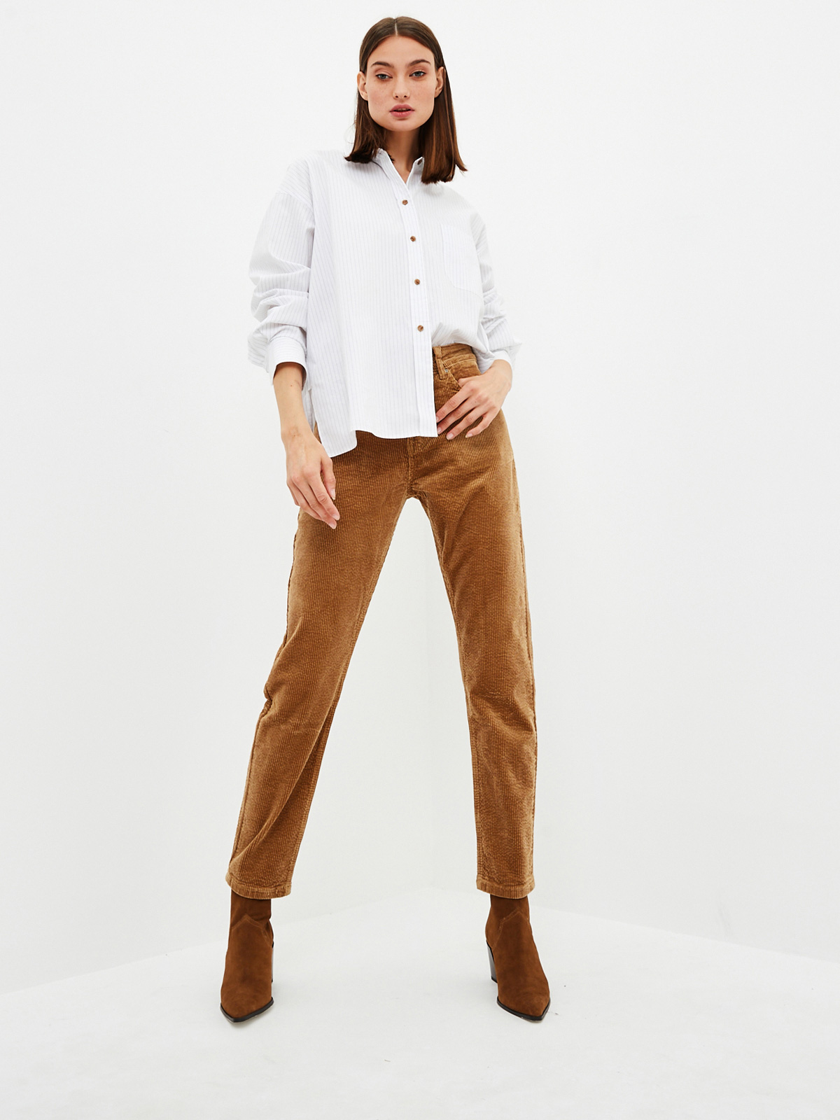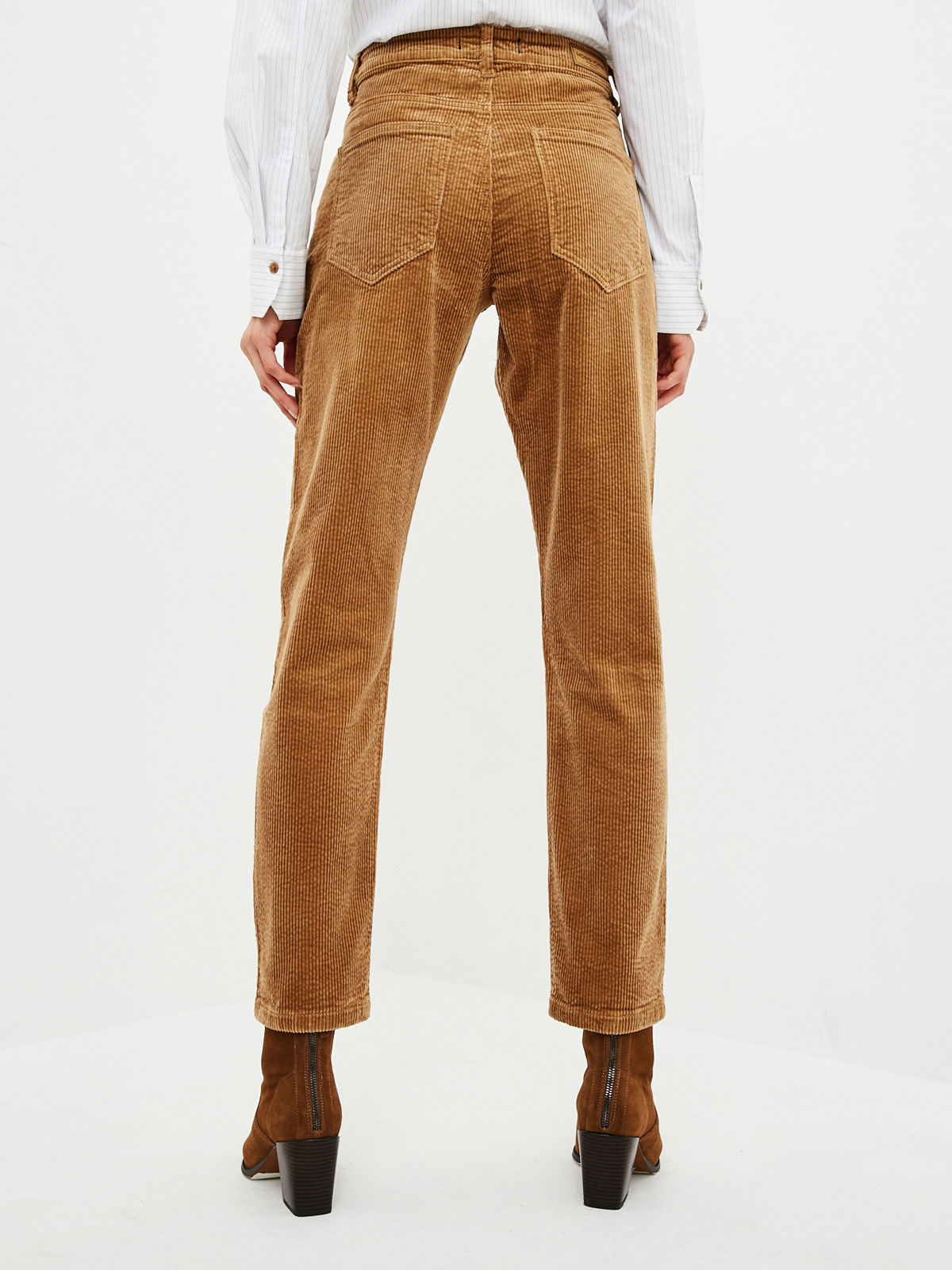 Хлопковые брюки силуэта бойфренд из плотной вельветовой ткани с матовым бархатным эффектом. Пятикарманная модель на рост 164-170 см с декорированным монетным карманом и металлическими заклепками на карманах спереди. На талии есть шлёвки для ремня и патч из экокожи "Mossmore". Размер на модели 27, рост 179 см.