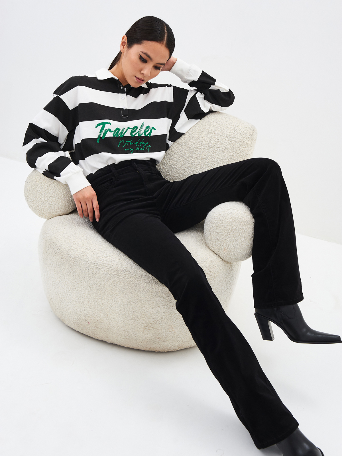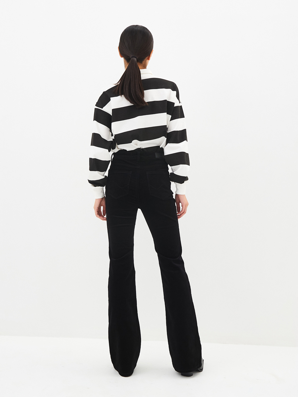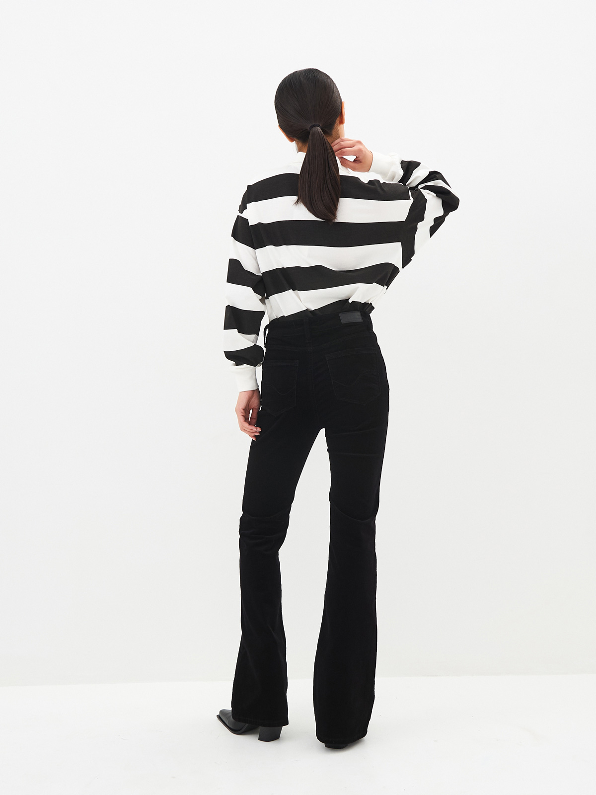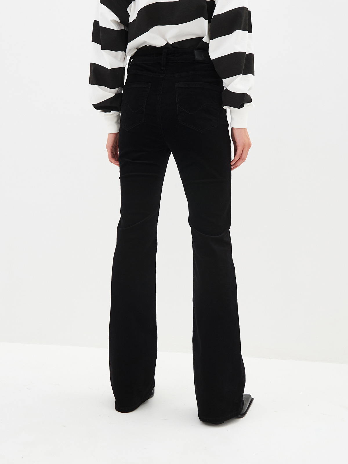 Женские брюки клеш из хлопковой микро вельветовой ткани с небольшим содержанием эластана на рост 176-182 см. Модель женских брюк из вельвета с высокой посадкой визуально стройнит, а натуральная ткань подарит приятные тактильные ощущения и комфорт. Стильные брюки клеш - это одновременно и современная классика, и популярный модный тренд, который идеально подходит для повседневной носки на каждый день. Брюки, расклешенные от колена с пятью карманами отличный вариант для осени и весны. Оригинальная модель идеально сидит на фигуре благодаря высокой талии , а мягкий вельвет в мелкий рубчик выглядит изящно и визуально не добавляет объема. Цветные брюки - отличный вариант для любителей выглядеть стильно и выделяться из толпы. Данная модель хорошая альтернатива прямым брюкам и джинсам клеш, она придает необычность, а также визуально удлиняет ноги. На талии есть шлевки для ремня, застёжка на металлическую молнию и пуговицу. Размер на модели 28, рост 175 см.