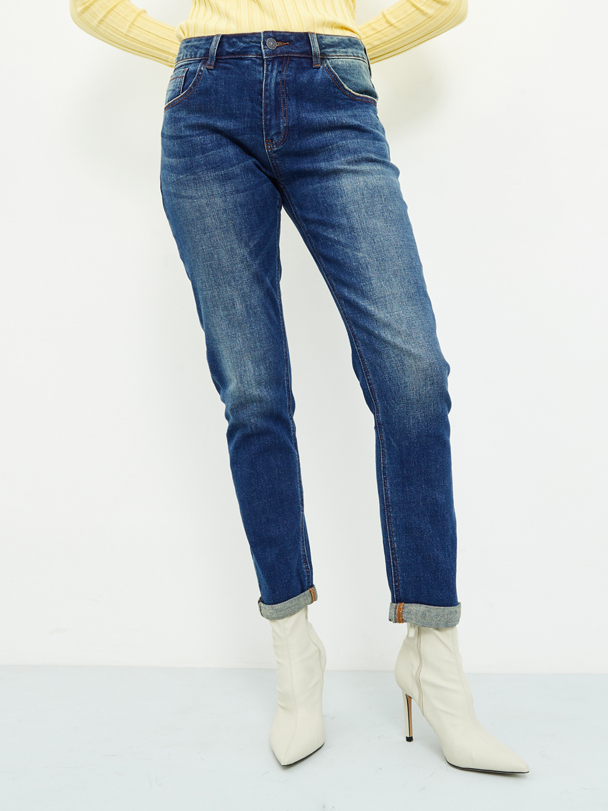 Джинсы бойфренды с небольшой потертостью плотного денима (13 oz) средней посадки с контрастной строчкой. Модель из ткани с добавлением эластана на рост 164-170 см с пятью карманами ручной обработки краев. Джинсы с подворотами и цветным оверлоком шва снизу. На талии есть шлёвки для ремня, а также фирменный патч из экокожи "Mossmore". Застёжка на молнию и болт-пуговицу. Размер на модели 27, рост 177 см.