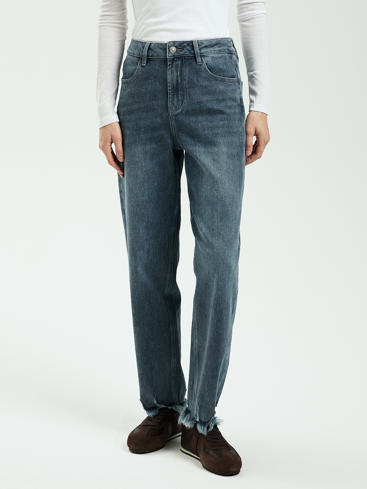Джинсы силуэта мом в цвете BUZ BLUE-GREY с винтажным дополнительным выкрасом денима, рассчитанные на рост 154-160 см, выполнены из хлопка с добавлением эластана. Это обеспечивает комфорт, мягкость и свободу движения, а также позволяет джинсам сохранять свою форму в течение дня. Высокая посадка на талии и прямые, более свободные по ноге брючины, зауженные внизу, создают стильный силуэт. Необработанный асимметричный низ добавляет шика и бунтарства, придавая джинсам уникальный вид. Эти джинсы идеально подходят как для casual-образов, так и для смелых вечерних аутфитов. Модель оснащена четырьмя карманами и контрастной строчкой, добавляющей интерес к деталям дизайна. Детали: высокая посадка, контрастная строчка, шлевки на талии, застежка на металлическую молнию и пуговицу.
