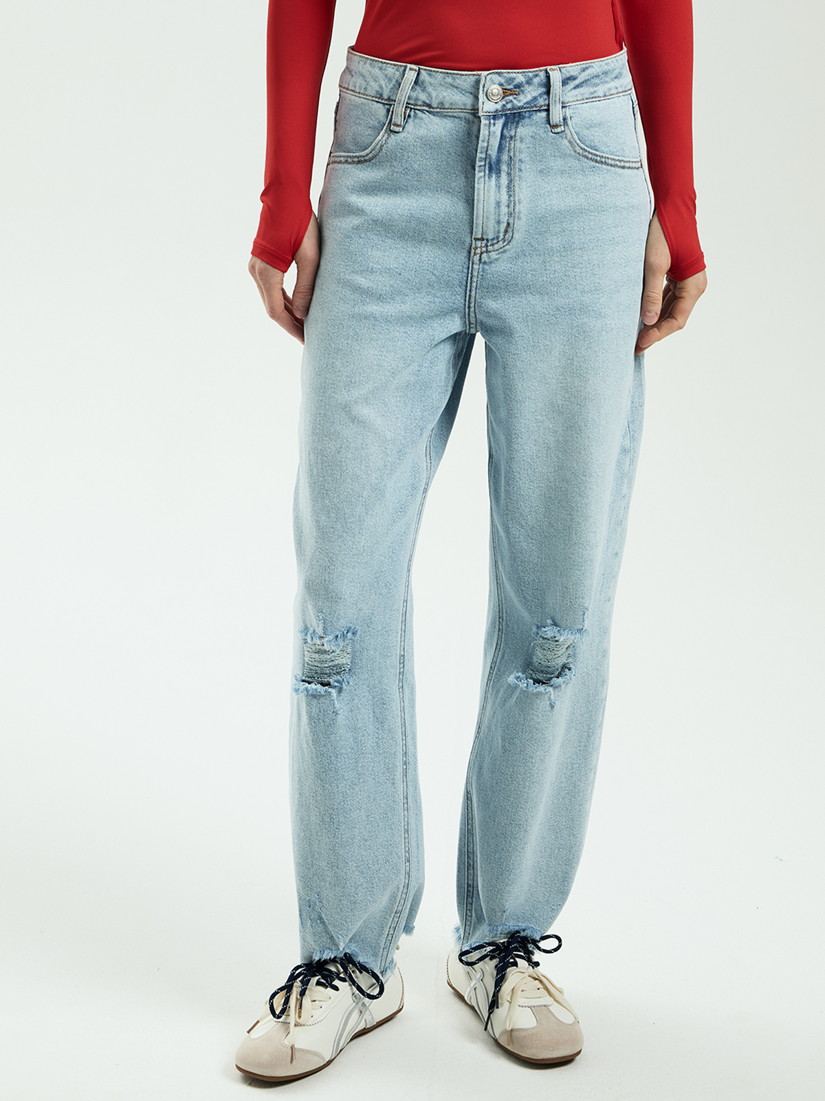 Джинсы выполнены из качественного денима с добавлением эластичной нити — ткань хорошо тянется и дарит комфорт в течение всего дня. Завышенная посадка визуально удлиняет ноги и подчёркивает талию. Свободный крой МОМ дополнен двумя деталями: необработанный край по низу с эффектом лёгкой рванины и разрывы на коленях. Они добавляют образу современной дерзости, но не перегружают модель. Пять классических карманов завершают образ.