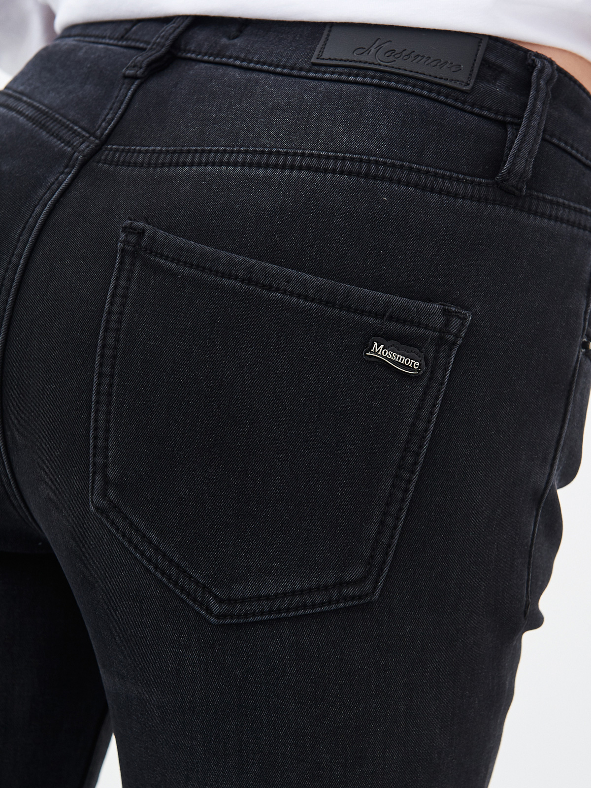 Модель имеет прямой силуэт, высокую посадку, шлёвки для ремня, застёжку на молнию и пуговицу, а также фирменный патч бренда Mossmore. Контрастная строчка по швам добавляет образу стиля и аккуратности.