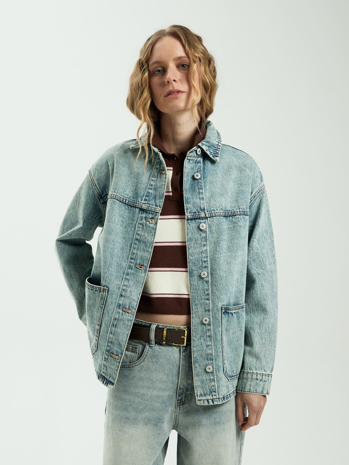 Джинсовый пиджак прямого свободного кроя, выполненный из 100% хлопка, сочетает в себе комфорт, стиль и практичность. Мы используем только высококачественный хлопок, который обеспечивает отличное качество и комфорт. Этот материал мягкий на ощупь, дышащий и прекрасно сохраняет форму. Длинные рукава, завершающиеся манжетами, придают пиджаку аккуратный вид и позволяют регулировать их длину по вашему желанию. Это добавляет дополнительный уровень комфорта и стиля. Практичные карманы по бокам обеспечивают удобство и функциональность. Застёжка на качественные металлические пуговицы добавляет характер модели, а также создает стильный контраст с текстурой денима. Джинсовый пиджак имеет прямой и удобный силуэт, который подходит для любого типа фигуры. Он легко компонуется с различными предметами гардероба, позволяя создавать как повседневные, так и более сложные образы. Пиджак представлен в нескольких популярных оттенках синего — от голубого до серо-голубого.