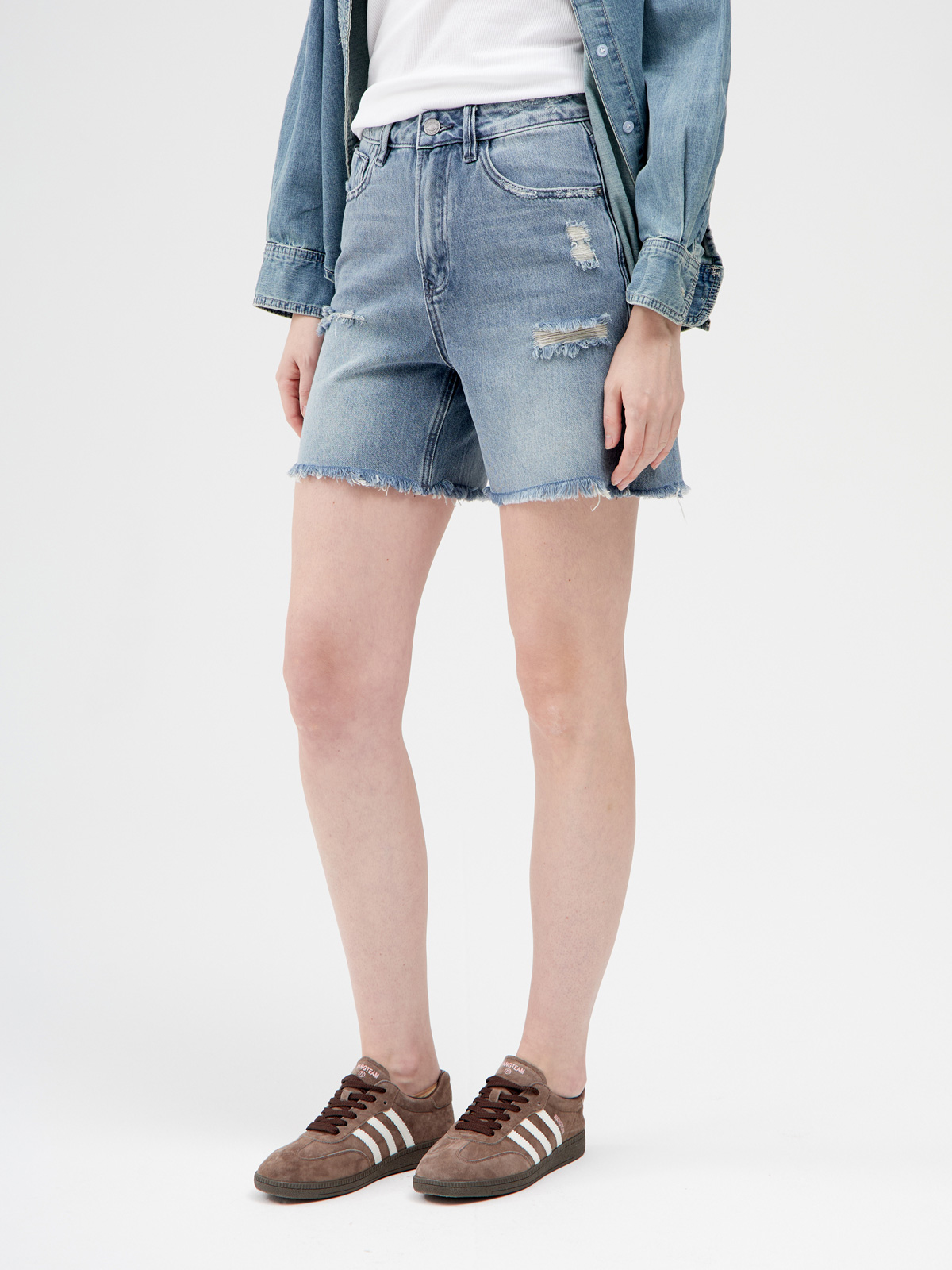 Женские короткие шорты из 100% хлопкового денима с бахромой и неровным нижним краем. Шорты изготовлены из качественного денима, что обеспечивает прочность и долговечность, а также комфортную посадку. Короткие шорты идеально подходят для теплых дней, позволяя чувствовать себя свободно и удобно. Бахрома и неровный нижний край придают шортам игривый и модный вид, а также создают эффект «поношенности» что сейчас очень актуально в моде. Неровный край делает их уникальными и оригинальными. Рваные прорези добавляют стильный акцент и подчеркивают неформальный стиль шорт, создавая расслабленный образ. Ручная обработка потертостей на карманах и других участках делает шорты более динамичными и создает ощущение, как будто вещь давно стала любимой. Шорты имеют классическую конструкцию с пятью карманами, что обеспечивает удобное использование. Шорты женские представлены в нескольких популярных цветах: сине-сером и голубом. Эти оттенки прекрасно сочетаются с разнообразными цветами летней одежды. Детали: высокая посадка.