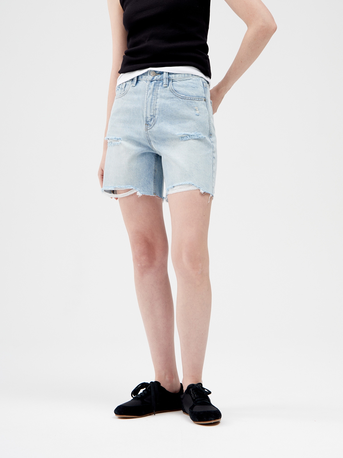 Женские короткие шорты из 100% хлопкового денима с бахромой и неровным нижним краем. Шорты изготовлены из качественного денима, что обеспечивает прочность и долговечность, а также комфортную посадку. Короткие шорты идеально подходят для теплых дней, позволяя чувствовать себя свободно и удобно. Бахрома и неровный нижний край придают шортам игривый и модный вид, а также создают эффект «поношенности» что сейчас очень актуально в моде. Неровный край делает их уникальными и оригинальными. Рваные прорези добавляют стильный акцент и подчеркивают неформальный стиль шорт, создавая расслабленный образ. Ручная обработка потертостей на карманах и других участках делает шорты более динамичными и создает ощущение, как будто вещь давно стала любимой. Шорты имеют классическую конструкцию с пятью карманами, что обеспечивает удобное использование. Шорты женские представлены в нескольких популярных цветах: сине-сером и голубом. Эти оттенки прекрасно сочетаются с разнообразными цветами летней одежды. Детали: высокая посадка.