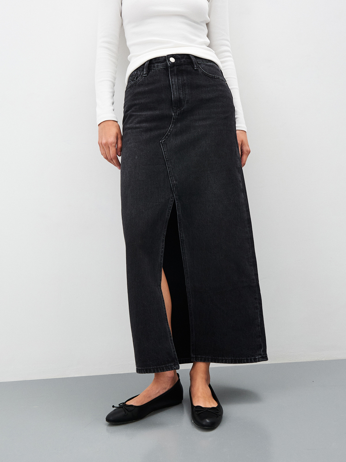 Джинсовая юбка с разрезом спереди и длинной макси выполнена из 100% хлопкового денима с потертостями и контрастной строчкой в синем цвете. Джинсовая юбка макси с разрезом придаёт уникальный шарм и позволяет выглядеть по-новому. Модель имеет высокую посадку на талии и пять карманов, что делает ее удобной и практичной. Изделие из плотного экологичного материала долго не изнашивается и подходит для повседневных образов. Её красивый фасон удачно подчёркивает женственность и стройность фигуры. Разрез, расположенный спереди, добавляет лёгкости и изящества. Юбку можно носить с различными футболками, нарядной блузкой или объёмным свитером в зависимости от погоды и случая. На талии есть шлевки для ремня, застёжка на металлическую молнию и пуговицу. Размер на модели 26, рост 176 см.