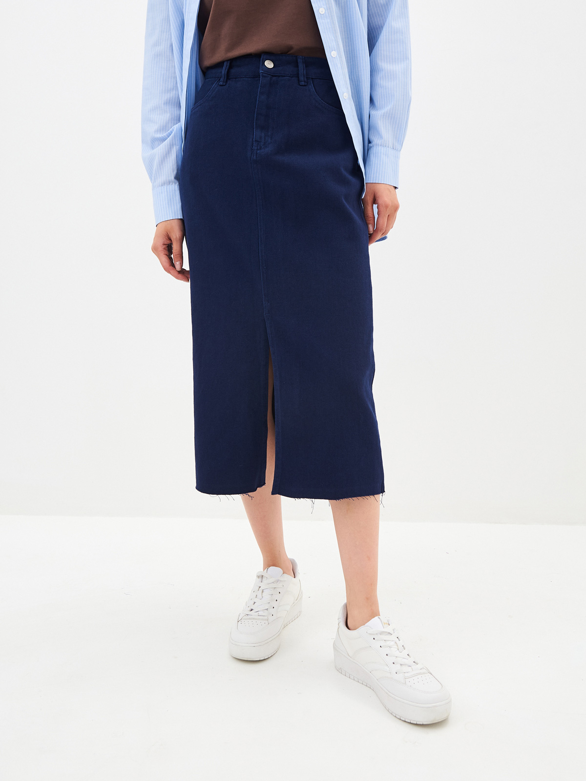 Женская юбка силуэта "карандаш" выполнена из 100% хлопковой рельефной ткани длиной миди и разрезом спереди, который зрительно удлиняет силуэт. Модель с четырьмя карманами и не обработанным нижним краем юбки. Данная модель изготовлена из натуральных и экологически чистых тканей с использованием окраски Garment dyed. Благодаря этому методу происходит точная цветопередача. Также эта технология окраски позволяет использовать меньше воды и электроэнергии. Джинсовая юбка миди из цветного денима идеальна для модного образа кежуал или романтичного лука. Утеплить демисезонный образ можно шерстяным пальто, ботильонами или высокими сапогами. На талии есть шлёвки для ремня и патч из эко кожи. Застёжка на металлическую молнию и пуговицу. Размер на модели 27, рост 175 см.